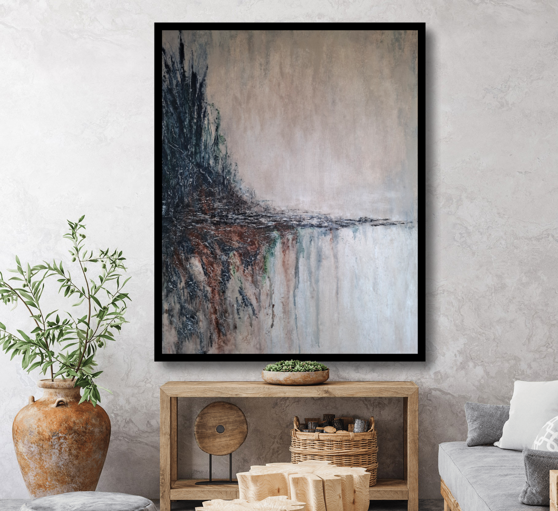 Technika mieszana – farby akrylowe i pasta strukturalna na płótnie. Praca opiera się na świadomym ograniczeniu środków wyrazu: zawężonej palecie barw, prostocie formy i znaczącej pustce. Dynamiczna, złożona faktura zbudowana z ciężkich nawarstwień po lewej stronie kontrastuje z niemal pustą, gładką przestrzenią po prawej. Ten kontrast buduje napięcie i prowokuje do kontemplacji.
