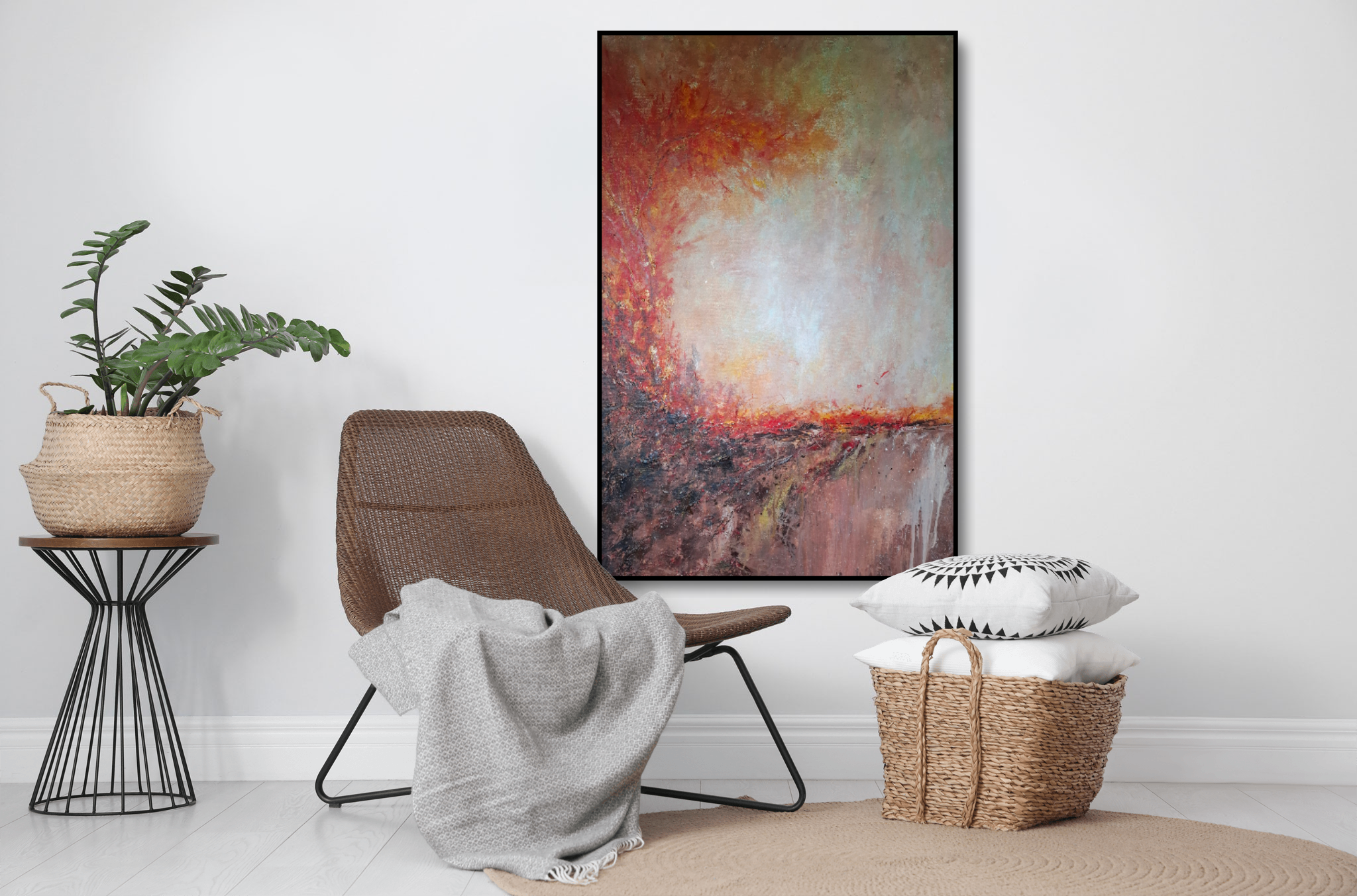 Ten obraz to abstrakcja, która pozostawia przestrzeń dla wyobraźni — jedni zobaczą w niej jesienne drzewo, inni ruch energii, emocji i wewnętrznego żaru. Dla mnie to obraz o sile życia płynącej z natury i z nas samych, o fali, która rodzi się w środku i rozlewa na zewnątrz.