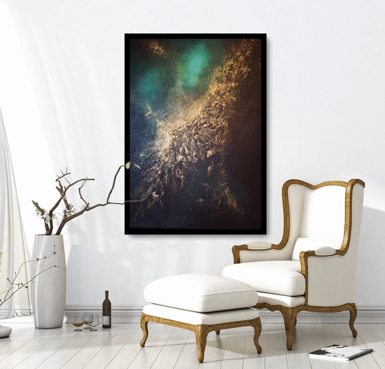 Abstrakcja wykonana w technice mieszanej z użyciem pasty strukturalnej, w moich ulubionych zestawieniach kolorystycznych — szmaragdowe zielenie, głębokie turkusy, przygaszone błękity i granaty. Złota farba podkreśla wypukłą fakturę, dodając świetlistych akcentów.