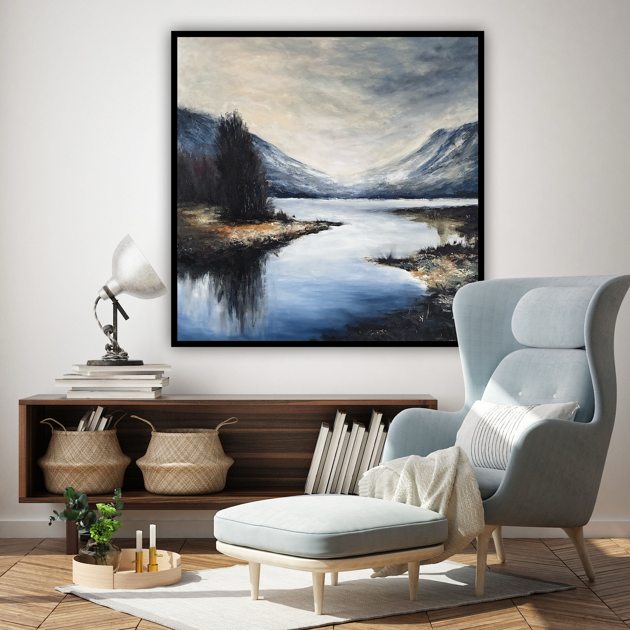 Surowa, chłodna paleta barw zestawiona z wyrazistą fakturą szpachli ma przypominać o sile natury i dać poczucie zakorzenienia. Gładkie przejścia tonalne nieba kontrastują z materialnością ziemi, tworząc przestrzeń idealną do wnętrz, które potrzebują oddechu.
